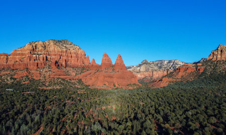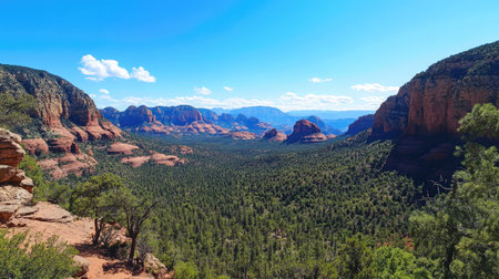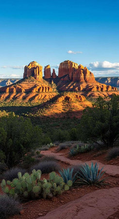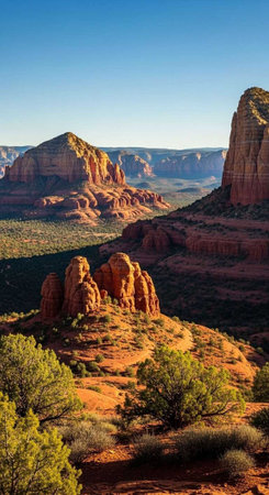 Experience the breathtaking beauty of Sedona's iconic red rock formations set against a backdrop of lush greenery and a bright blue sky, perfect for outdoor lovers and photographers.
