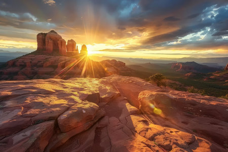A stunning sunset over a landscape of red rock formations, with golden rays of light illuminating the scene.