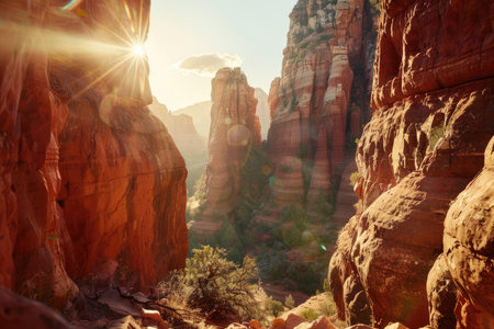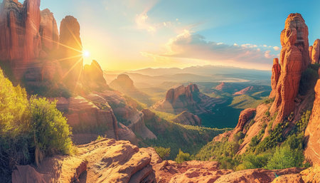 A breathtaking view of a canyon with towering red rock formations bathed in the warm glow of sunlight, with lush greenery dotting the landscape.