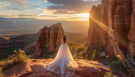 A woman wearing a white dress stands on a clifftop, gazing out at a breathtaking sunset over a desert landscape.