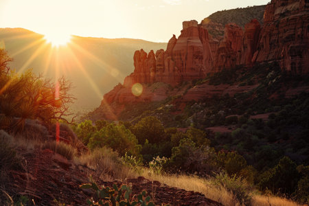 Sun flare on rock spires at the top of cathedral rock in Sedona Arizona