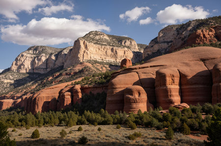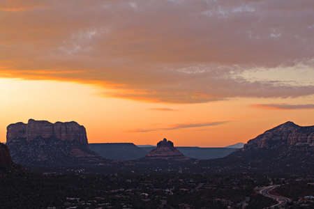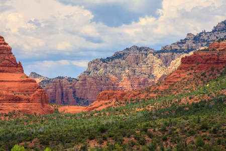 Sunset view of red rock buttes and formations within coconino national forest in Sedona Arizona USA against white cloud background. Horizontal Image.