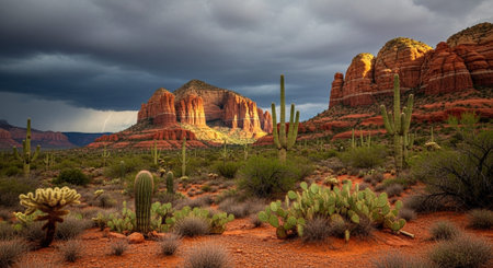 Majestic red rock formations at blue hour with dramatic clouds in the sky, Coconino National Forest, Arizona