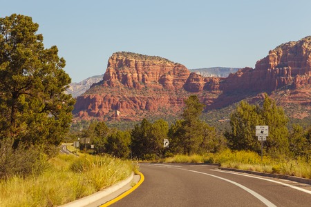 The natural beauty of the red rock canyons and sandstone of Sedona in Arizona. Road leading through the canyon.