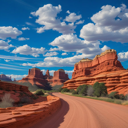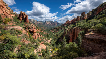 Explore a stunning landscape of Sedona's iconic red rocks framed by lush greenery and a bright blue sky with dramatic clouds, ideal for nature lovers and adventurers.