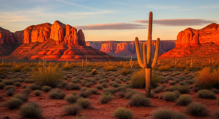 A picturesque landscape of red rock formations bathed in the golden rays of the sun, creating a breathtaking scene of natural beauty in a desert canyon.