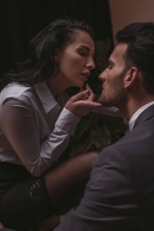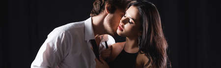 side view of sexy woman kissing bearded boyfriend on leather couch with lighting isolated on black, banner