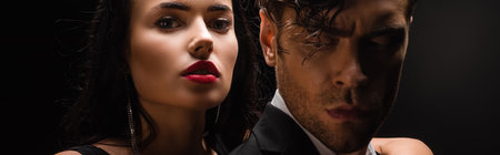 panoramic shot of attractive woman hugging handsome man isolated on black