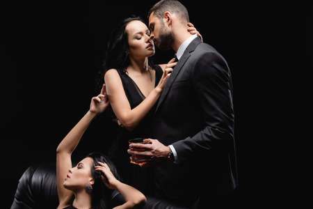 Young bearded man touching sexy girlfriend in dress on leather couch isolated on black