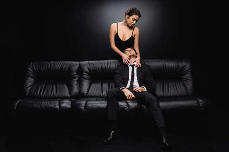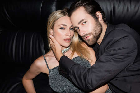 seductive woman in slip dress hugging man sitting on leather couch on black