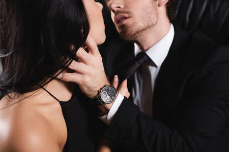 partial view of male hand passionately touching hip of woman in silk dress on black background