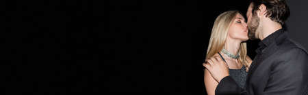 Sexy blonde woman kissing boyfriend in jacket on black background, banner