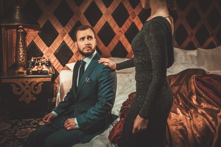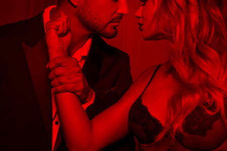 Strong dominant rich man holding blonde lovers hand in red light, passionate couple