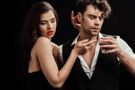 Beautiful woman with red lips touching boyfriend with glass of whiskey isolated on black