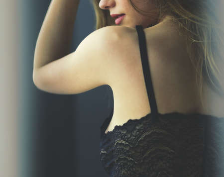 Horizontal view of woman in sexy lingerie