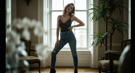Look into the cam. Young brunette cute slim model wearing skinny jeans looking into the camera