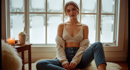 Beautiful young woman in a sweater and jeans sitting on the windowsill.