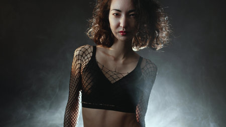 Modern dance, a young woman dancing on a dark background, atmospheric lighting in smoke. A girl in black pants and a mesh blouse performs modern movements in heels
