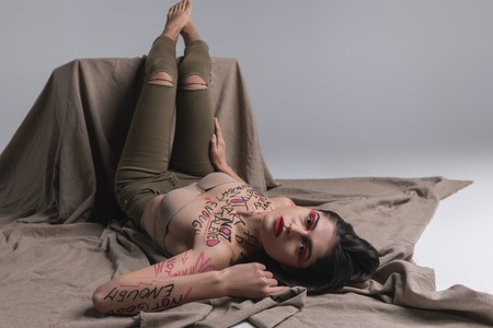 Sexy model with a perfect figure posing in bodysuit on the couch. Mixed media