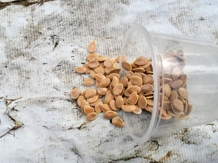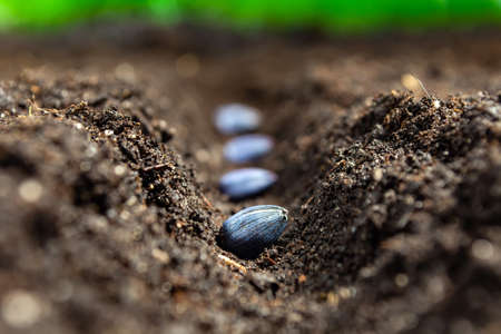 Growing vegetable seeds on seed soil in horticulture garden metaphor, agriculture concept. Sowing seeds in open ground