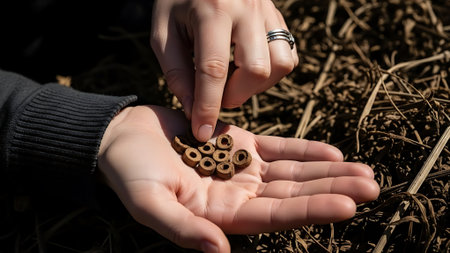 A close-up view of hands holding and examining seed pods in a natural setting