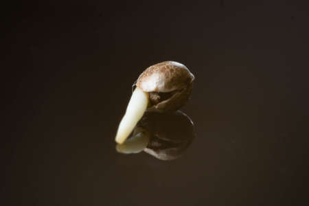 Germinated cannabis seed. Details Root on a black background, Sprouting cannabis seeds. close-up macro. Sale of cannabis seeds . Hovering Hemp .