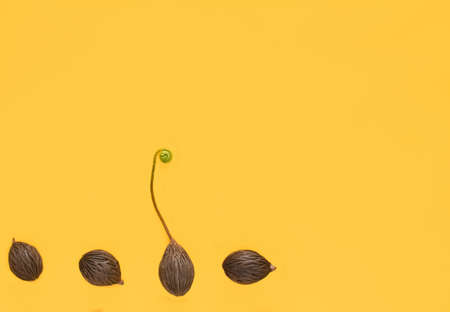 Sapling grow from plam seeds on yellow background.(top view)