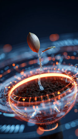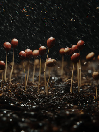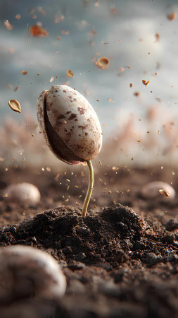 Dynamic explosion of seeds above rich soil with sprouting potential. That the image is generated using AI.