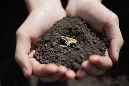 A farmer holds a seed in his hands, the theme of agriculture is to preserve nature.
