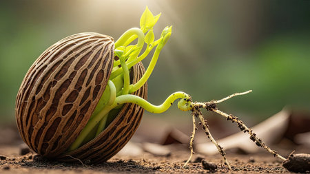 An image captures a seed in the process of sprouting, showcasing vibrant green shoots and delicate roots. The composition displays detailed textures of the seed and the surrounding earth, lit by natural lighting. The photograph suggests concepts of growth and new beginnings, suitable for various editorial and commercial applications.