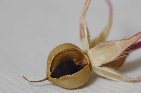 Dried seeds of a plant on a wooden table. Selective focus.