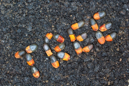 sunflower seeds, blue from pickling, planted in rows in soil.
