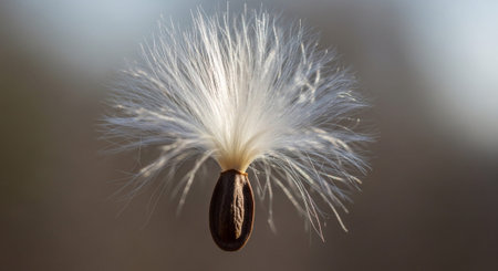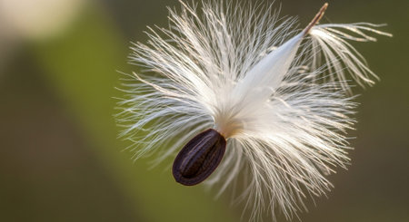 AI Generated. A macro image of seeds scattered as they fall from a milkweed pod