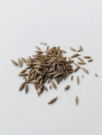 A detailed close-up of cumin seeds on a white background, highlighting their unique texture and natural brown color, ideal for culinary use.