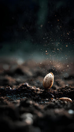Dynamic explosion of diverse seeds over rich soil captures growth and diversity theme. That the image is generated using AI.