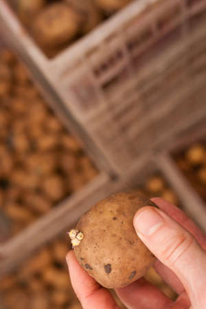 Potatoes raw vegetables food in market and man hand. Close up photo.
