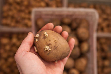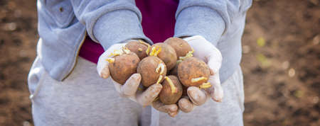 Women's hands hold potato tubers. Early spring preparation for the garden season.A farmer plants potatoes with a sprout in the garden. Growing organic vegetables.