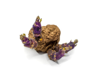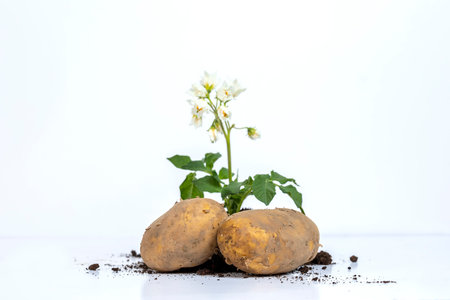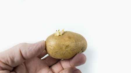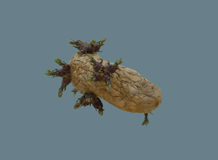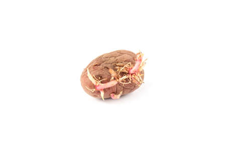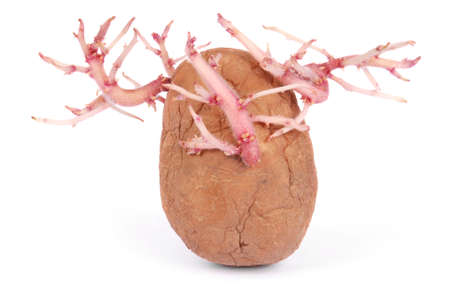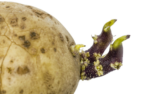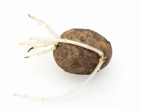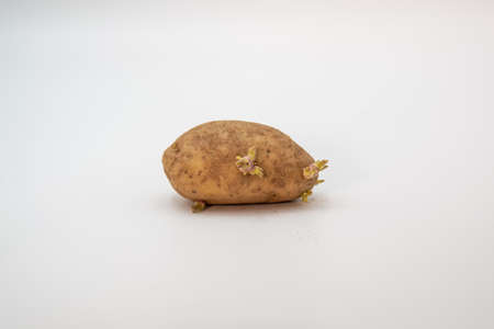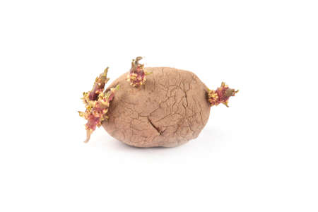 A detailed view of a potato with a sprout emerging, set against a white background to showcase its growth and natural development.