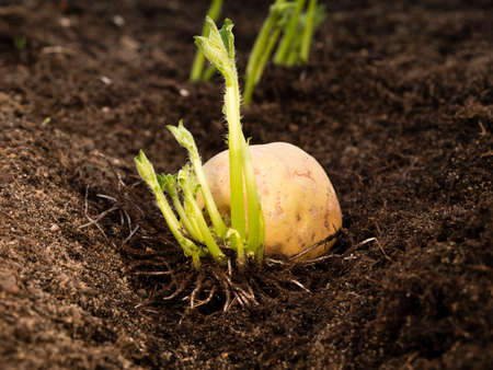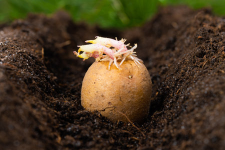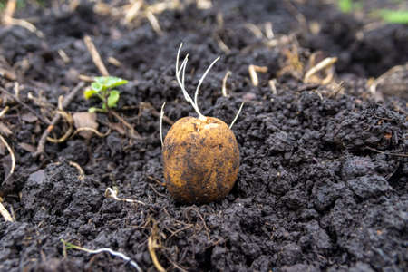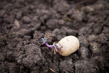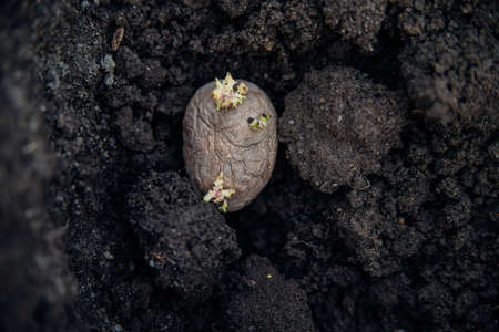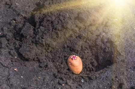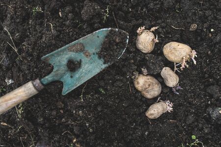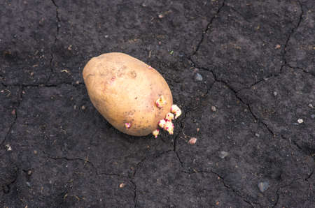 potato on the ground, planting sprouted tubers spring, agrarian background