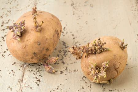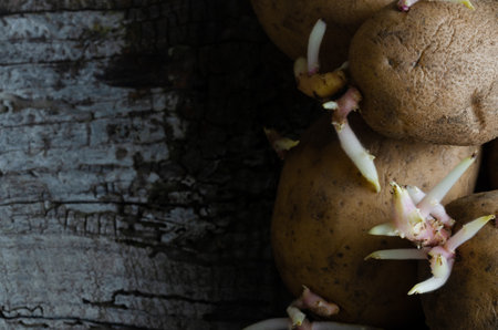 Sprouted potato. It is a starchy tuber of the plant Solanum tuberosum and is a root vegetable from Americas. It is a perennial in the nightshade family Solanaceae. Shot on rustic wooden background