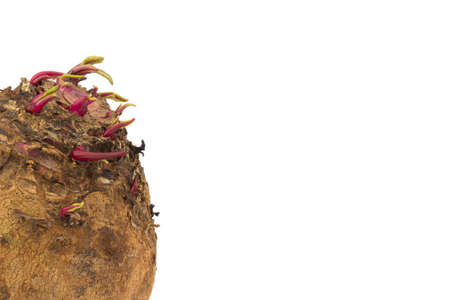 Sprouted sweet potato. The sweet potato or sweetpotato is a dicotyledonous plant that belongs to the bindweed or morning glory family, Convolvulaceae. Shot on white background