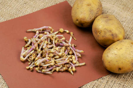 Sprouted potatoes on a background of coarse sacking. Autumn harvest. Seed potatoes for planting. Close up