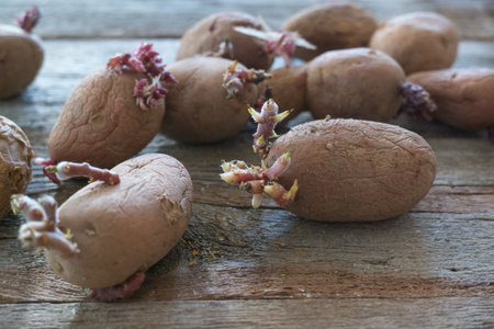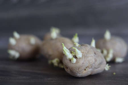 Potatoes with sprouts on a wooden background. Seed potatoes for planting
