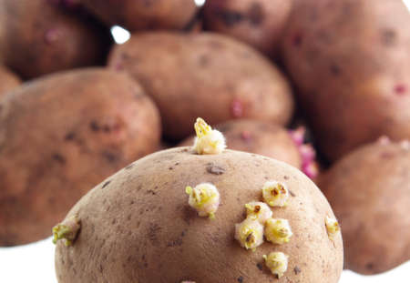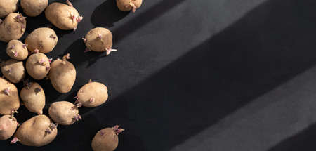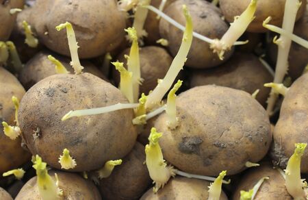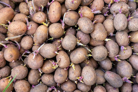 Sprouted seed potatoes close-up. A lot of old sprouted potatoes for planting.