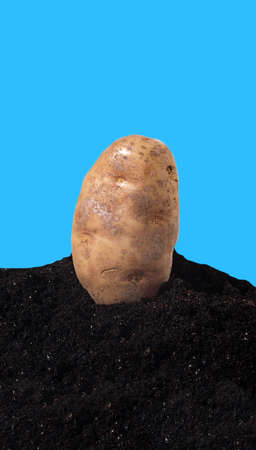 Ripe brown bio potato held in hand by Caucasian male. Close up studio shot, isolated on blue background.