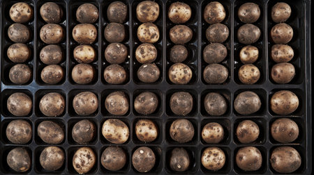 Seed potatoes of the Charlotte salad variety in chitting trays, top-down view, preparing for planting season.
