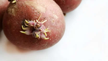 Sprouted potatoes. The eyes of the potatoes are red. Sprouts on potatoes before planting. Potatoes for planting - sprouted with sprouts.
