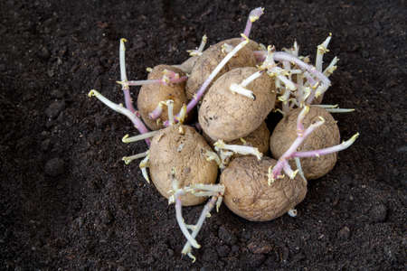 Potato tubers are lying on the ground. Early spring preparation for the garden season. Potatoes with a sprout in the garden on the bed. Growing organic vegetables.