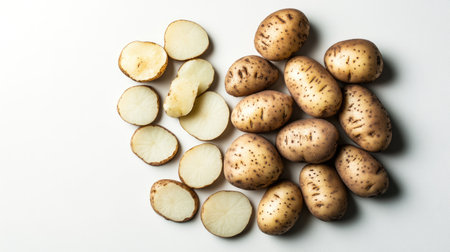 A clean white background showcases fresh potatoes, both whole and sliced. Ideal for food photography, cooking blogs, and healthy eating visuals.