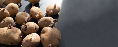 Close-up of sprouted potatoes. Potato tuber ready for planting in the ground. On yellow background. Copy space